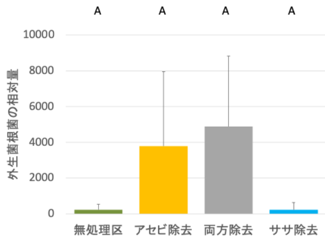 アセビを除去した区(左から2番目)とアセビとササの両方を除去した区(左から3番目)で無処理区(左端)よりも相対量が高まる傾向が確認された(アセビ除去の効果で有意差:p<0.05)。一方、ササ除去の効果は見られなかった(有意差:p>0.05)。全体的に処理による統計的な差の有無は限定的(多重比較(Tukey 法)の結果:p>0.05)であったが、アセビ除去の効果が大きい傾向があった。