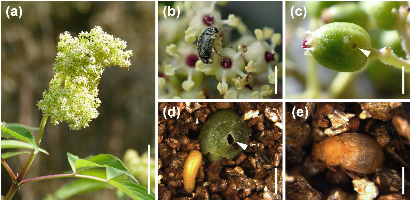 こうした背景のもと、神戸大学大学院理学研究科の河島鈴さん(博士前期課程2年)、末次健司教授、人間環境大学の久松定智准教授らの研究グループは、ニワトコとケシキスイ※3の関係に着目しました。ニワトコは日本各地の山林から里山にかけて生育する落葉低木で、春に多数の白い小花からなる花序をつけ(図1a)、6月頃に赤い果実を形成します。ケシキスイは古くから「ニワトコの種子を食べる甲虫」として知られてきましたが、この甲虫が送粉にどの程度関与しているのか、また両者の関係がどのように維持されているのかについては、これまで十分に明らかにされていませんでした。