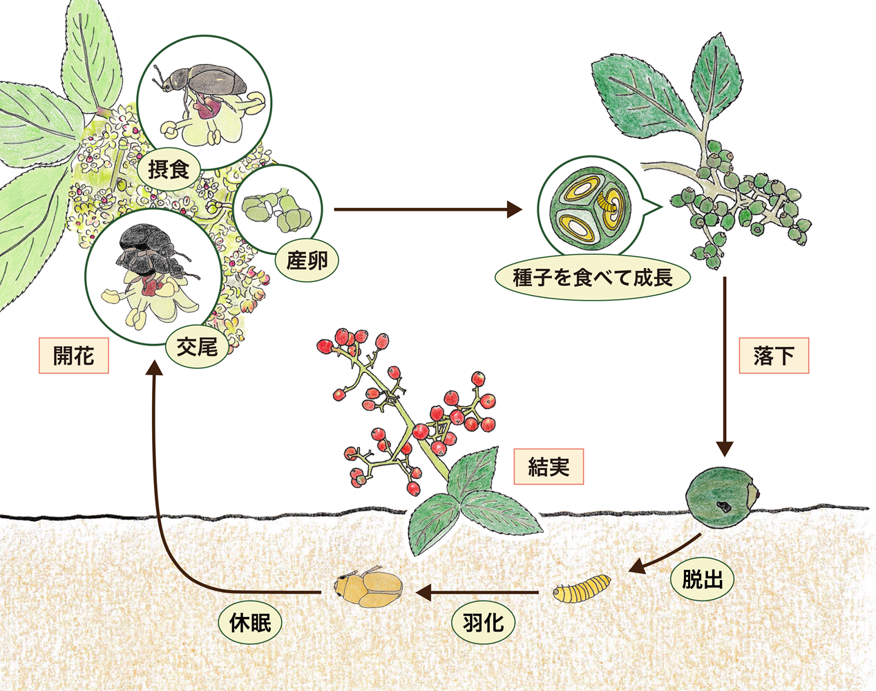 以上の結果から、ニワトコとケシキスイの関係では、果実の落下が両者にとって利益をもたらす重要な役割を果たしていることが明らかになりました。果実の落下が送粉者と植物の双方の利益につながることを実証的に示したのは本研究が初めてであり、進化的に不安定と考えられてきた共生関係が、どのように安定して維持されているのかを示す新たな仕組みを提示した重要な成果といえます。