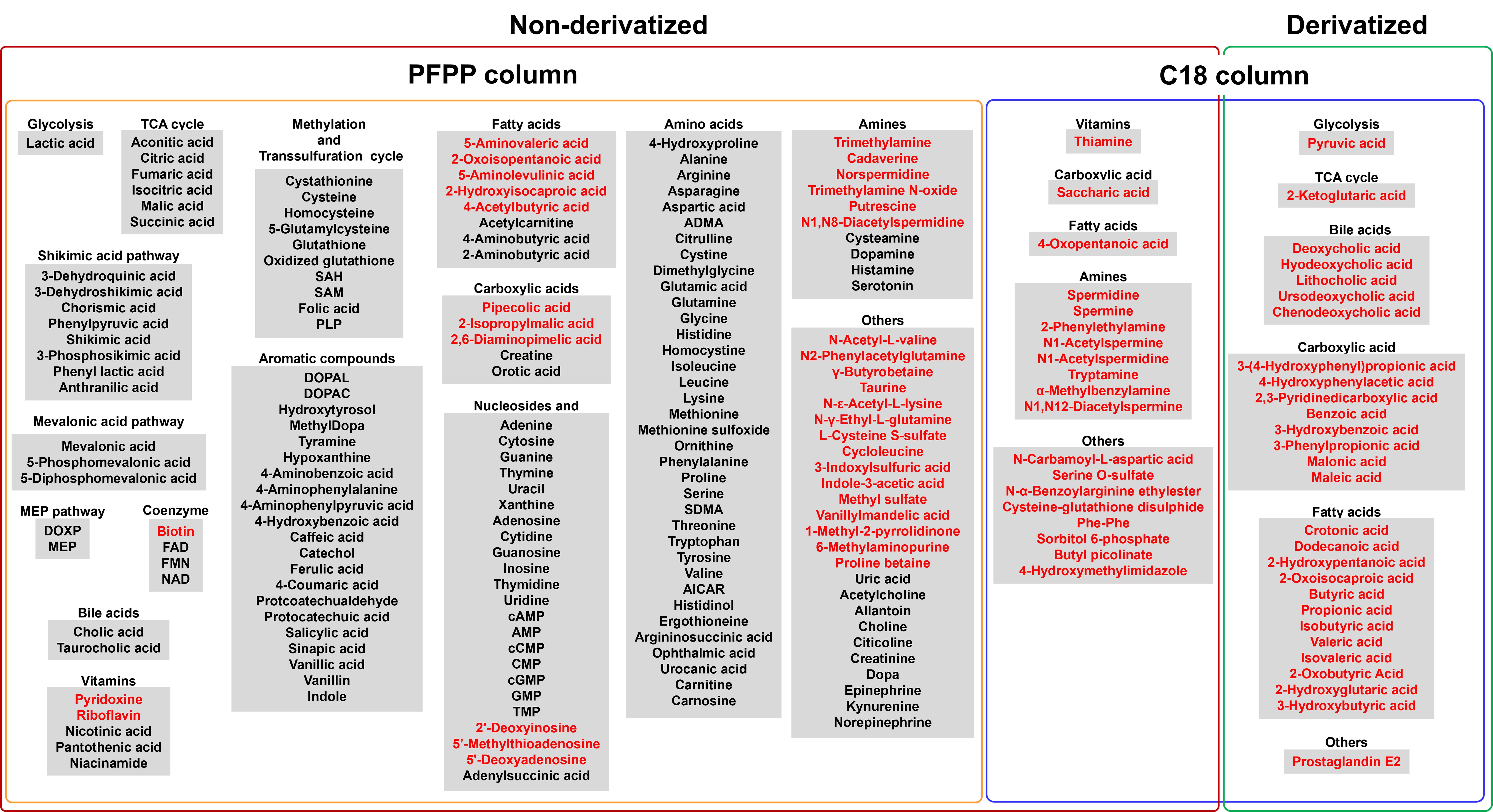 - 本手法では、分離特性の異なるPFPPカラム※5とC18カラム※6(+誘導体化)を同一の枠組みで組み合わせることで、腸内細菌叢研究で重要な代謝物を中心に計215代謝物をハイスループットに一括定量が可能となった。