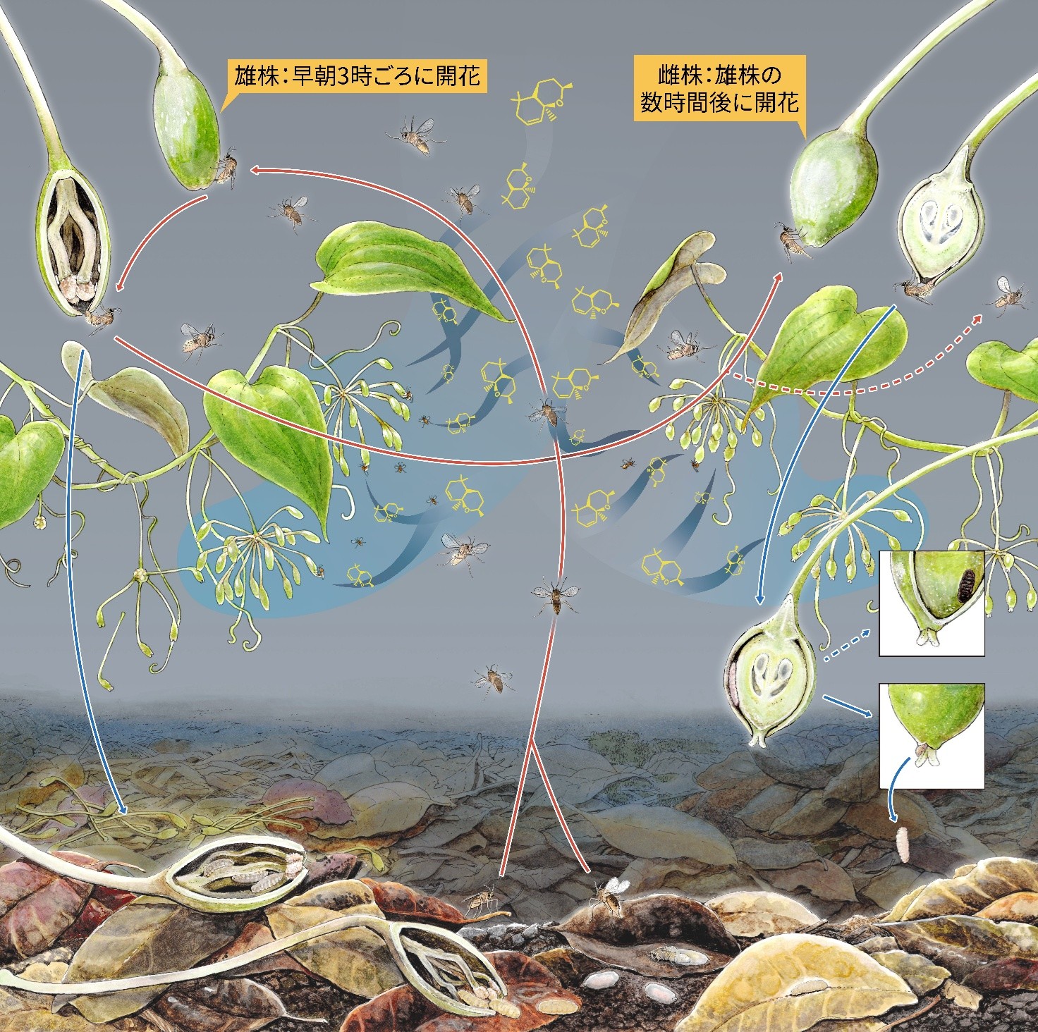 - 雄花と雌花はほぼ同じ香りを放つため、タマバエは香りだけでは両者を区別できず、その結果として受粉が成立する。