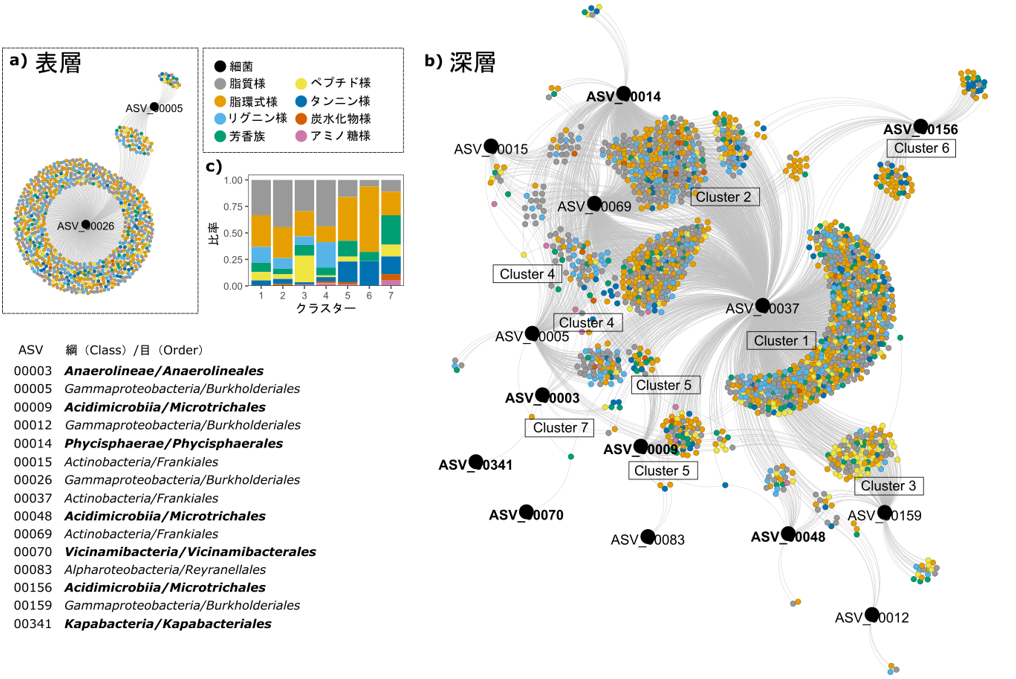 その結果、深層では有機物と微生物の間に強く安定した対応関係が存在し、約1700種類の分子式と特定の細菌群が対応する構造を形成していることが明らかになりました(図2)。また、窒素を多く含む分子や酸化された分子が、深層に特徴的な細菌群と対応することも示されました。一方、表層ではこうした関係は弱く、より変動的であることが分かりました。