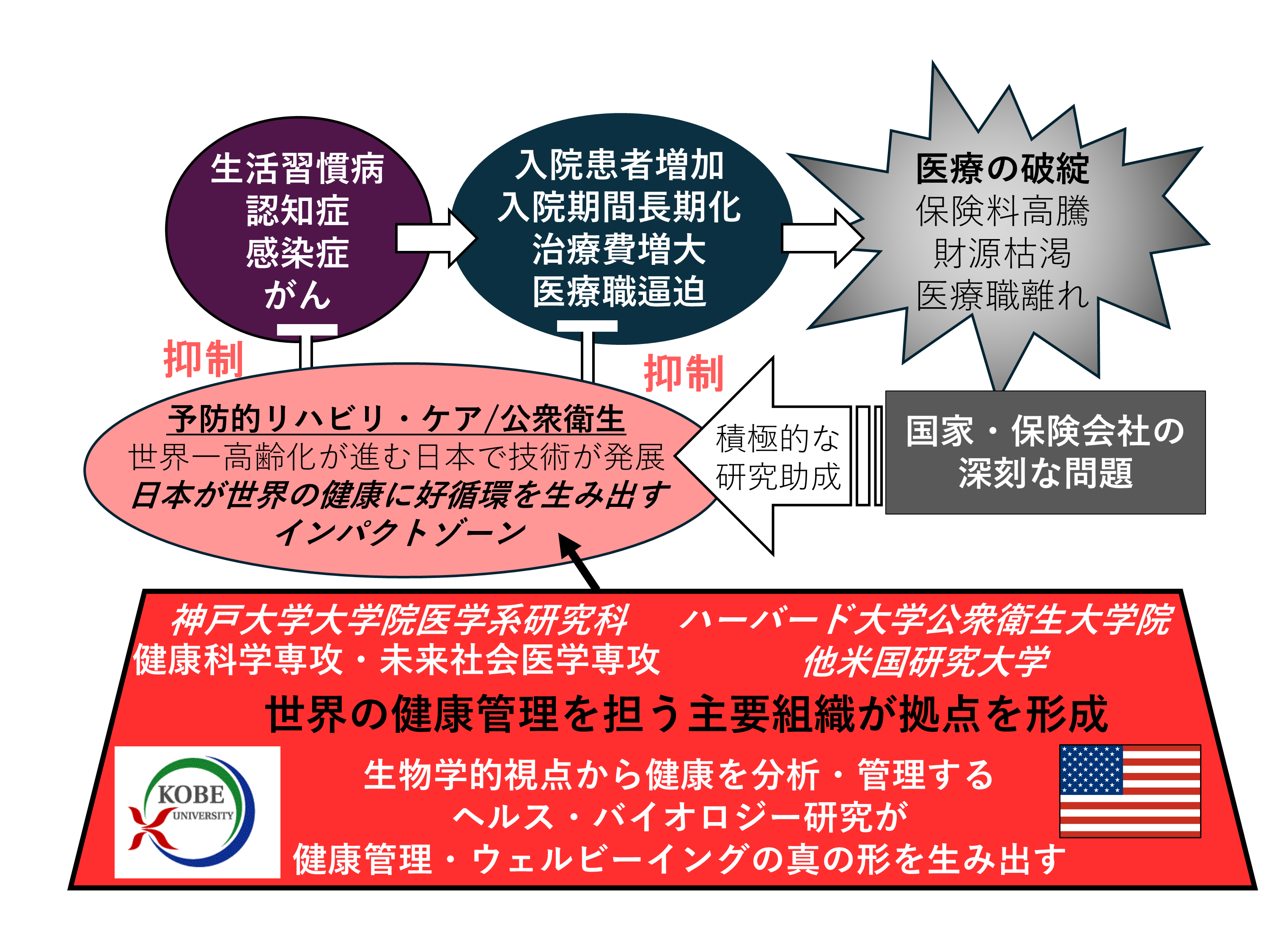 これらの成果を踏まえ、日米の共同研究により日本および本学が世界の医療を支え、好循環を生み出すインパクトゾーンを確立することを目指し、『ヘルス・バイオロジー研究拠点』の構築を進めます。