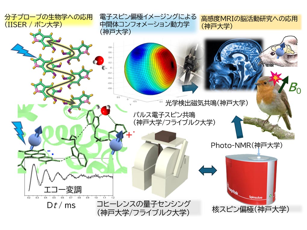 国際共同研究の課題としては、磁気受容(magnetoreception)機構の解明、スピンを介したフォトン・アップコンバージョン機構の検討、ならびに多量子ビット系における電子スピンダイナミクスを支配する分子振動といった要因の理解を中心に進めています。