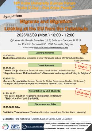 本シンポジウムは、「EUを外から見る」という視点で、日本・ラテンアメリカの研究者、ブリュッセル自由大学(ULB)及び神戸大学の学生・教職員が、移民・移住をめぐる問題について議論を行うことを目的としています。移民・移住は、グローバル化が進展する現代社会において最も重要なテーマの1つであるとともに、「人の移動」は、私たち一人ひとりにとって身近な経験でもあります。