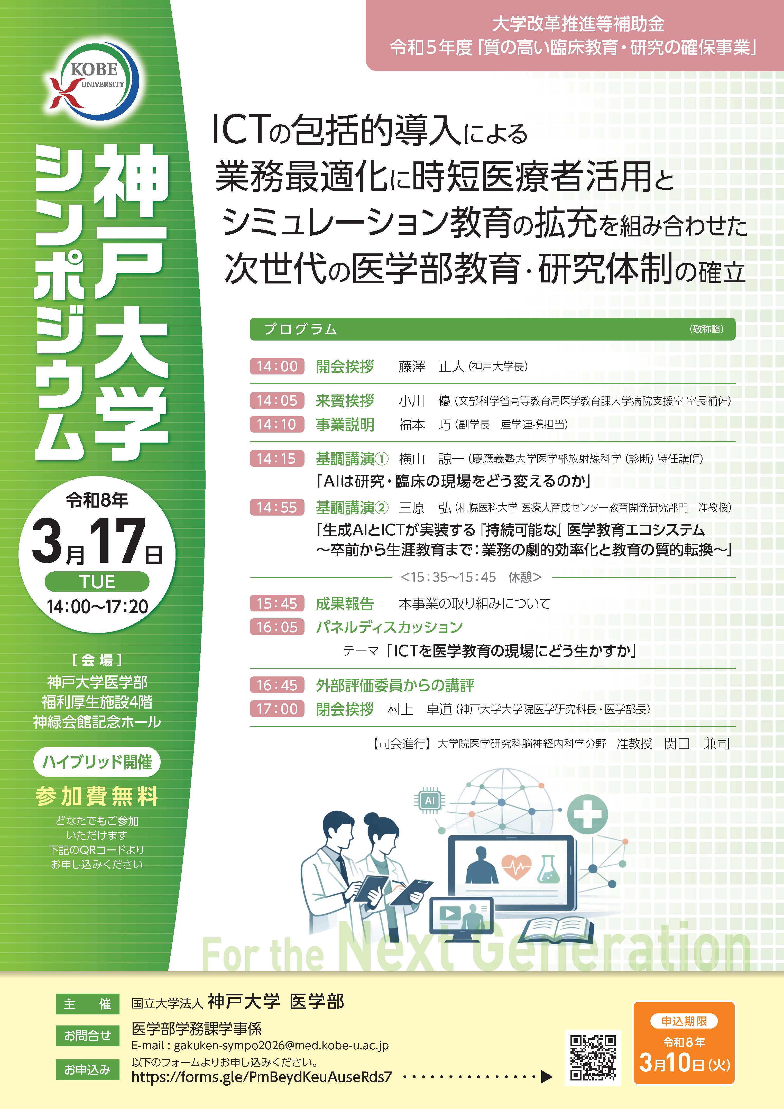 - 問い合わせ先:医学部学務課学事係 ( gakuken-sympo2026[at]med.kobe-u.ac.jp)※ [at] を @ に変更してください。