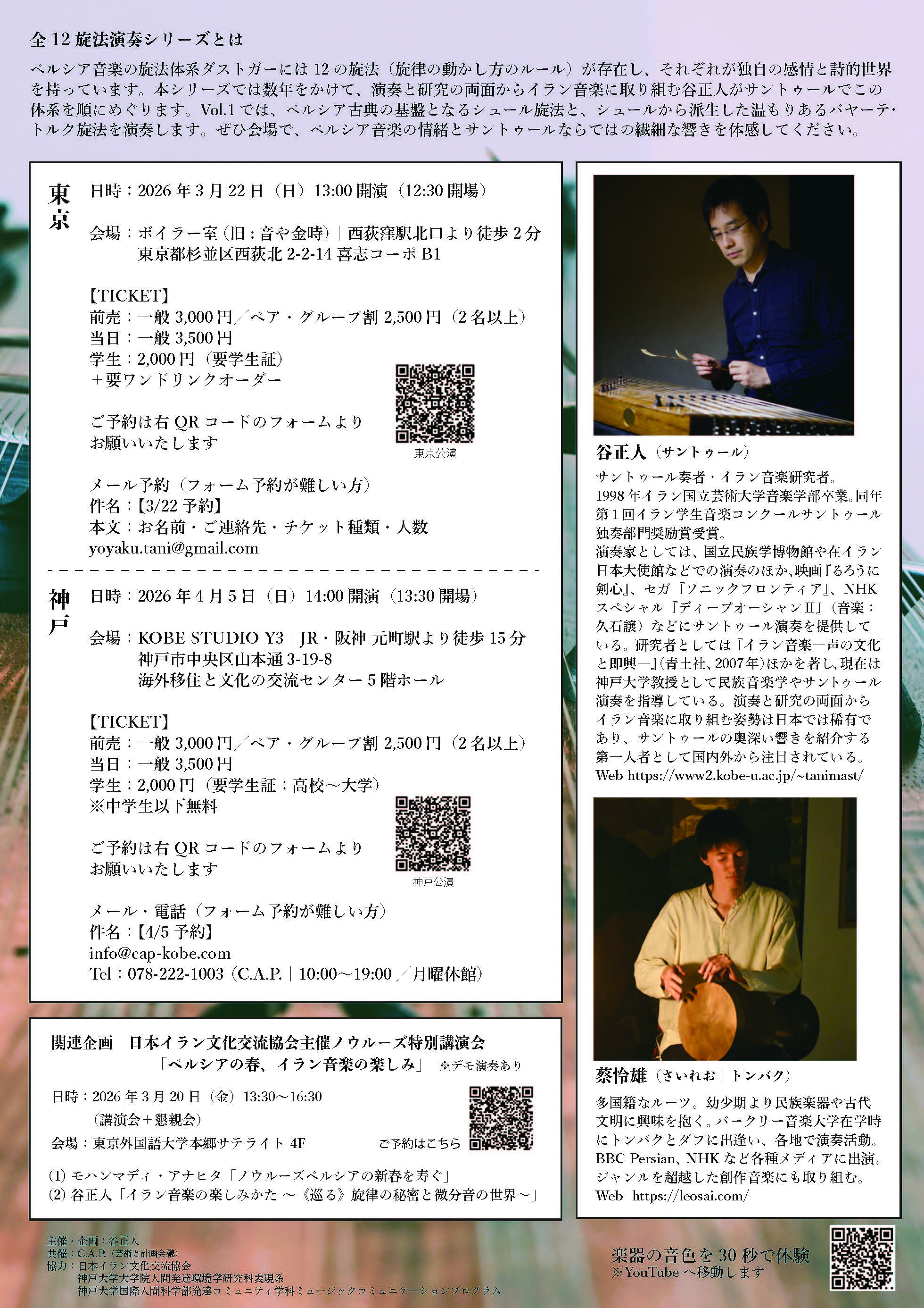 本企画は、神戸大学大学院人間発達環境学研究科教授であり、サントゥール奏者・イラン音楽研究者でもある谷正人が、ペルシア古典音楽の旋法体系「全12旋法」を、数年をかけて演奏と研究の両面から順次取り上げていくシリーズの第1回です。今回は、ペルシア音楽の基盤をなす旋法世界の一端を、サントゥール独奏を中心に紹介します。ゲストとして、トンバク奏者の蔡怜雄氏を迎えます。