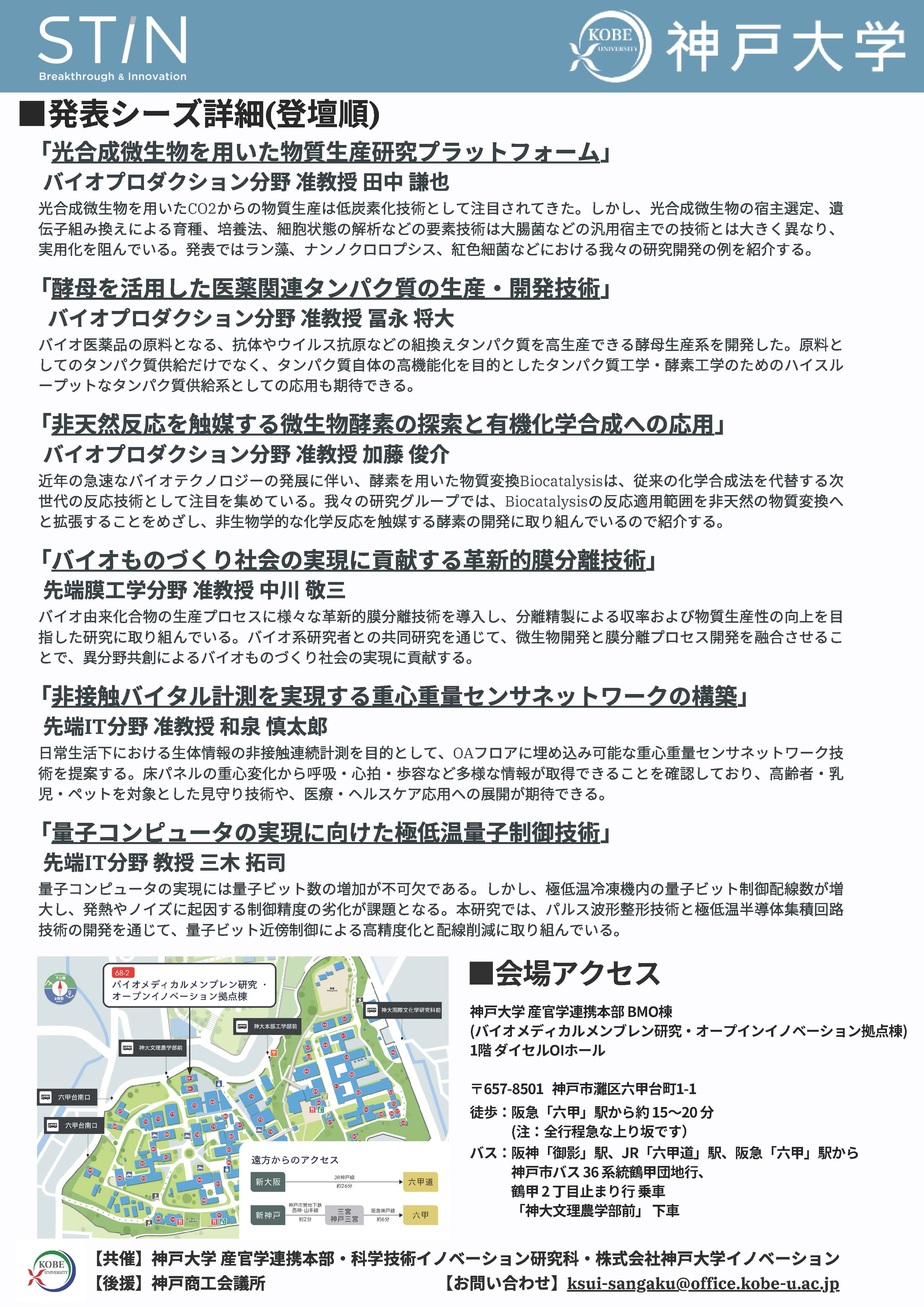 - 会場:神戸大学 産官学連携本部 バイオメディカルメンブレン研究・オープンイノベーション拠点棟1階 ダイセルOIホール(兵庫県神戸市灘区六甲台町1-1)