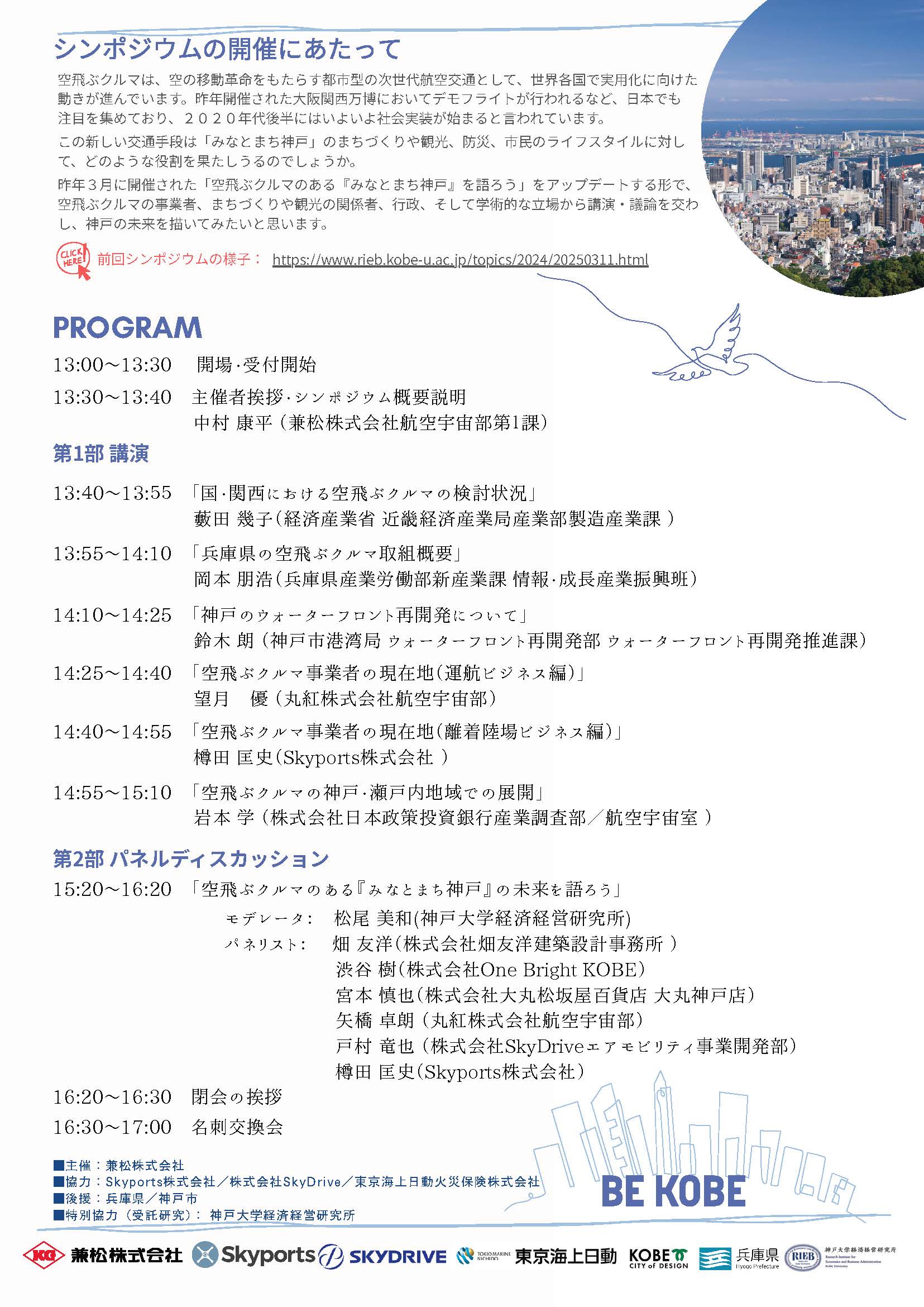 昨年3月に開催された「空飛ぶクルマのある『みなとまち神戸』を語ろう」をアップデートする形で、空⾶ぶクルマの事業者、まちづくりや観光の関係者、⾏政、そして学術的な⽴場から講演・議論を交わし、神⼾の未来を描いてみたいと思います。