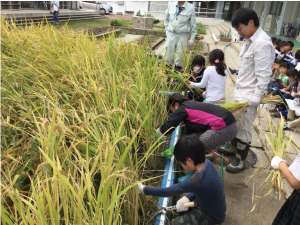 附属小学校の先生の努力のおかげで、児童の教室からすぐに見える花壇を改装し、田んぼを作ってもらいました。毎年のことですが、田植えはいつも大変で、ほとんどの児童は初めての体験です。70人くらいの児童に苗の持ち方や植え付け方を指導し、児童は田んぼの泥と戦いながら、3〜4株ずつ植えていきました。児童から見るとすぐ側にお米があるため、みんなでよく観察し、変わった様子があればすぐに先生に知らせて、また田んぼにいる虫のことを懸命に調べる児童もいました。穂ができたあとにはスズメなどが食べに来ることをあらかじめ知らせ、児童みんなが多くのかかしを作り、お米を守るようにしていました。昔ながらの方法で児童は鎌を使って収穫した後1週間から10日間程天日で干し、手作業と機械を使って脱穀と調製をしていき、みんなで玄米に仕上げていきました。使っている米品種は「はいごころ」といい、GABA(ガンマ-アミノ酪酸)が多いなどの高い機能性を持っています。収穫量は毎年異なりますが、児童らが育てた「はいごころ」の発芽玄米を通常のお米に混ぜてみんなで食べています。その試食会やお米の授業の発表会に招待されたこともありました。児童からの質問はいつも積極的で鋭い質問もありました。