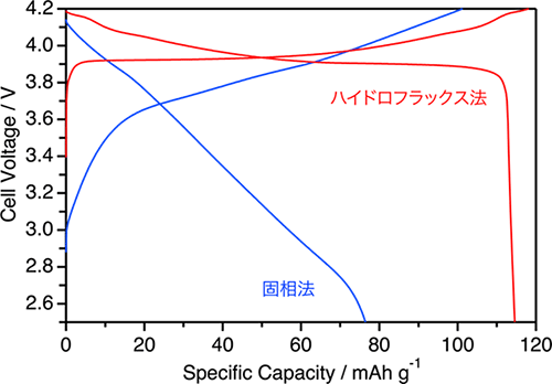 ハイドロフラックス法で合成した試料は高い可逆容量が得られる。